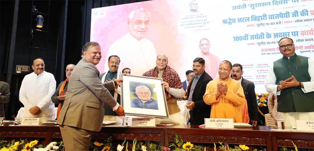 लखनऊ । भारत रत्न व पूर्व प्रधानमंत्री अटल बिहारी वाजपेयी जी की 100वीं जयंती के अवसर पर लोकभवन में सुशासन दिवस समारोह आयोजित किया गया। इस अवसर पर मुख्यमंत्री योगी आदित्यनाथ और रक्षा मंत्री राजनाथ सिंह ने उनकी प्रतिमा पर पुष्पांजलि अर्पित की और अटल जी के जीवन और कार्यों को याद किया।