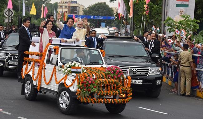 मोदी ने भारत आए अतिथियों को औपनिवेशिक शासन के खिलाफ अहिंसक संघर्ष में चरखा के महत्व को बताया। यह पहला मौका है जब मोदी किसी दूसरे देश के शासनाध्यक्ष के साथ संयुक्त रूप से रोड शो कर रहे हैं जो दोनों देशों के करीबी संबंधों और आबे के साथ घनिष्ठता को प्रदर्शित करता है। रोड शो के दौरान सड़क के किनारे उपस्थित भीड़ भारत और जापान के राष्ट्र ध्वज को लहरा रही थी। इस दौरान भारतीय संस्कृति के विविध आयामों को प्रदर्शित करने के लिये विभिन्न स्थानों पर 28 मंडप बनाये गए थे। कलाकार रंगबिरंगी पोशाक धारण किये हुए लोक नृत्य समेत अन्य सांस्कृतिक कार्यक्रम पेश कर रहे थे। यह रोड शो अहमदाबाद हवाई अड्डे से शुरू हुआ और करीब आठ किलोमीटर की दूरी तय करता हुआ साबरमती आश्रम पर समाप्त हुआ।