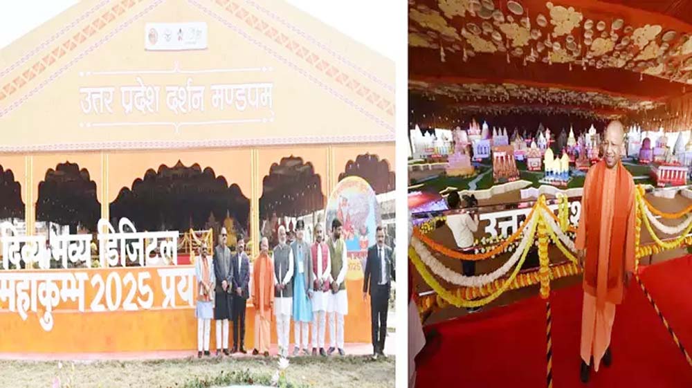 महाकुम्भ नगर। मुख्यमंत्री ने सेक्टर 7 में तैयार किए गए कला कुम्भ का भी शुभारंभ किया। यूपी स्टेट पवेलियन का शुभारंभ करने के बाद सीएम योगी ठीक सामने बने कला कुम्भ पहुंचे और यहां उन्होंने उत्तर प्रदेश संस्कृति विभाग के द्वारा निर्मित इस अनूठे शिविर का अवलोकन किया। परिसर में विभिन्न सांस्कृतिक झांकियों के बीच सीएम योगी ने फीता काटकर परिसर का उद्घाटन किया। निरीक्षण के दौरान उन्होंने हॉल में मौजूद कलाकृतियों के विषय में भी जानकारी प्राप्त की, जबकि थ्रीडी के माध्यम से कला कुम्भ से संबंधित वीडियो भी देखा। यहां से मुख्यमंत्री सीधे प्रदर्शनी हॉल में गए, जहां उन्होंने सजाई गई अनूठी कलाकृतियों, विभिन्न मंदिरों की रेप्लिका और प्रदर्शनी को सराहा। उन्होंने कला कुम्भ को कुम्भ के विकास का प्रमाणिक दस्तावेज करार दिया। इस दौरान प्रमुख सचिव पर्यटन एवं संस्कृति मुकेश मेश्राम ने उन्हें स्मृति चिन्ह भी भेंट किया।