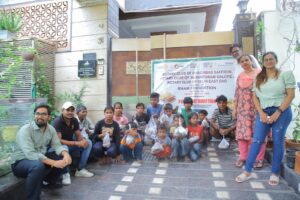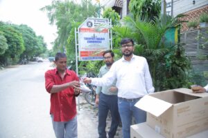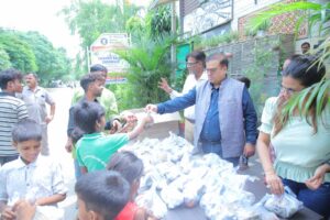 मुख्य अतिथि रोटेरियन रवि बाली ने डॉ. धीरज कुमार भार्गव व उनके परिवार के सदस्यों के साथ स्व. श्री जय किशन भार्गव जी की स्मृति में राह चलते लोगों को छोले भटूरे के पैकेट्स और फल दिए।