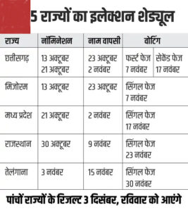 नई दिल्ली(TBC News): पांच राज्यों की 679 विधानसभा सीटों पर चुनाव की तारीखों का ऐलान आज हो गया। मुख्य चुनाव आयुक्त राजीव कुमार ने बताया कि मिजोरम में विधानसभा चुनाव 7 नवंबर को होगा। छत्तीसगढ़ में विधानसभा चुनाव 7 नवंबर और 17 नवंबर को दो चरणों में होगा। मध्य प्रदेश में विधानसभा चुनाव के लिए मतदान 17 नवंबर को होगा। राजस्थान में विधानसभा चुनाव के लिए मतदान 23 नवंबर को होगा। तेलंगाना में विधानसभा चुनाव के लिए मतदान 30 नवंबर को होगा। सभी राज्यों में मतगणना 3 दिसंबर को होगी। मिजोरम विधानसभा का कार्यकाल इस साल 17 दिसंबर को समाप्त हो रहा है। वहां मिजो नैशनल फ्रंट सत्ता में है। तेलंगाना, राजस्थान, छत्तीसगढ़ और राजस्थान की विधानसभाओं का कार्यकाल अगले साल जनवरी में अलग-अलग तारीखों पर समाप्त हो रहा है।