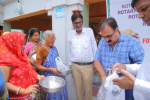 खाने के पैकेट्स में गरमागरम छोटे भटूरे थे। खाने के पैकेट्स मिलते ही लोगों के चेहरे खिल गए। स्पेशल गेस्ट आफ आनर रोटेरियन रवि बाली ने भी अपने हाथों से छोटे-छोटे बच्चों को खाने के पैकेट्स दिए। गेस्ट आफ आनर रोटेरियन नरेश ढींगरा, रोटेरियन संदीप मिगलानी ने भी लोगों को खाने के पैकेट्स दिए।