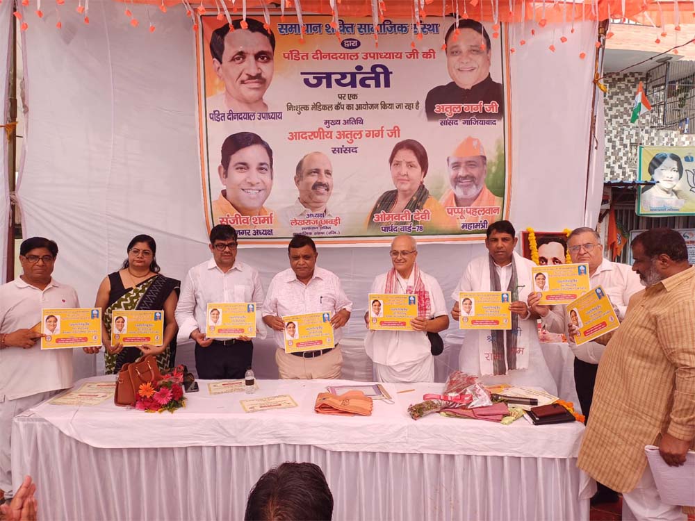 गाजियाबाद। समाधान शक्ति सामाजिक संस्था द्वारा महानगर महामंत्री पप्पू पहलवान के नेतृत्व मे पंडित दीनदयाल उपाध्याय की जयंती पर शालीमार गार्डन बूथ नंबर 830 पर निशुल्क मैडिकल कैंप और निशुल्क राशन वितरण किया गया जिसमे मुख्य अतिथि सांसद अतुल गर्ग और भाजपा महानगर अध्यक्ष संजीव शर्मा पूर्व विधायक सुरेश कश्यप डॉ मयंक जैन डॉ इरा जगदीश विज एमके सेठ मौजूद रहे । मेडिकल कैंप का काफी लोगों ने लाभ लिया। समाज के लिए निस्वार्थ भाव से सामाजिक कार्य करने पर करीब 210 सामाजिक संस्था के लोगों को सर्टिफिकेट देकर प्रोत्साहित किया गया। गरीबों को निशुल्क राशन वितरित किया गया । इस अवसर पर पार्षद राहुल शर्मा पार्षद रामनिवास बंसल पार्षद प्रवीण भाटी पार्षद हिमांशु शर्मा डी एन कोल प्रतीक माथुर लेखराज छाबड़ी प्रेम त्यागी जितेंद्र कुमार भूषण लाल अनिल शर्मा सुनील शर्मा भूपेंद्र गोस्वामी संजीव गुप्ता राजीव गुप्ता सुबोध भड़ाना मनोज मिश्रा अंजू घनशाला रूपा मुखर्जी सुमन सती निशा चौहान अनीता राणा आदि अन्य गणमान्य सम्मिलित हुए ।